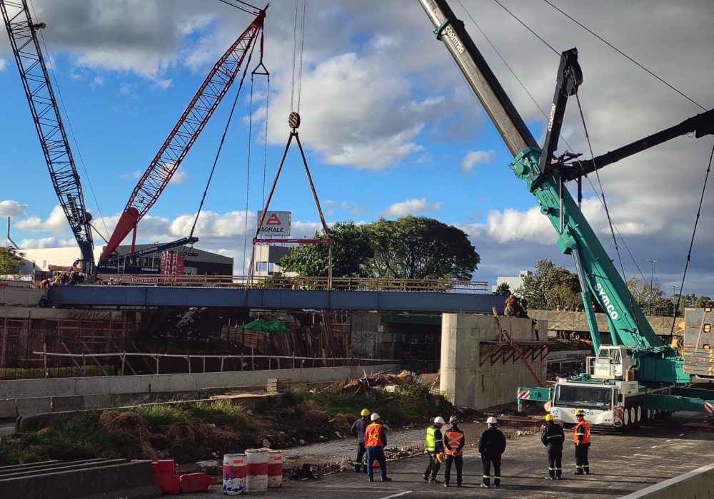 Durante este fin de semana, también se avanzó con el montaje de un nuevo puente ferroviario para el tren Belgrano Sur, sobre la colectora norte de la autopista, con el objetivo de generar la estructura necesaria para que se pueda excavar por debajo un paso que permita darles continuidad a los dos carriles de su traza. Esto requirió otro operativo similar al anterior con dos grúas pesadas para mover las dos losas que formarán el nuevo puente. Cada una de ellas mide 20 metros de largo x 6,20 metros de ancho y un peso de 110 toneladas cada una.